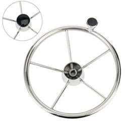 Destroyer style steering wheel with hub , center cap with Knob Product Features 5 spoke stainless steel 3/4″ shaft with (1) notch tapered keyway 13 1/2″ diameter x 3