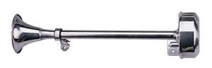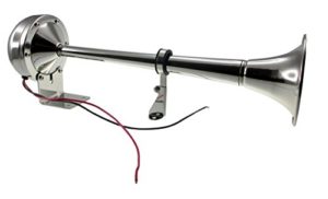 This is a single trumpet horn made of stainless steel, and it is designed for boat, rv, truck. It comes with mounting hardware. 12v. Dimensions: 15 1/2″ by 4″