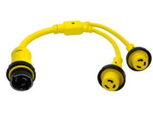 Product Description Marine Shore Power Y Adapter Molded Plug & Connector, 3 ft, (1)50A lock plug to (2)30A locking 125/250V to 125V Locking Connector with LED Power Indicator Light
